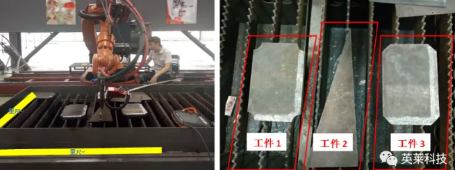● 現(xiàn)場的設(shè)備:KUKA C4系統(tǒng)、英萊激光視覺焊縫跟蹤系統(tǒng)、割炬、落料臺等。