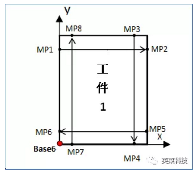 將工件1作為KUKA機器人的一個Base,測試過程中工件1用BASE[6]進行了表示。故,以左圖中箭頭方向為序,從MP1開始,到MP8點數(shù)據(jù)均可得到。下一步只需求得工件1在機器人坐標(biāo)系下的位姿(也即base_data[6])數(shù)據(jù)即可。